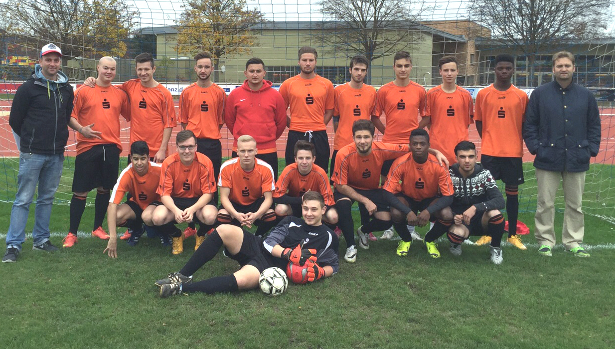 Das Team des Berufskolleg Erkelenz, ob. Reihe v. links: Boris Lonsing (Lehrer), Artem Scheermann, David Schatschneider, Jan Ockun, Sinan Demir, Justin Fischer (C), Maurice Hastenrath, Mehmet Yilmaz, Robin Jackels, Malcom Vitenu, Orson Maarschalkerweerd (Lehrer);