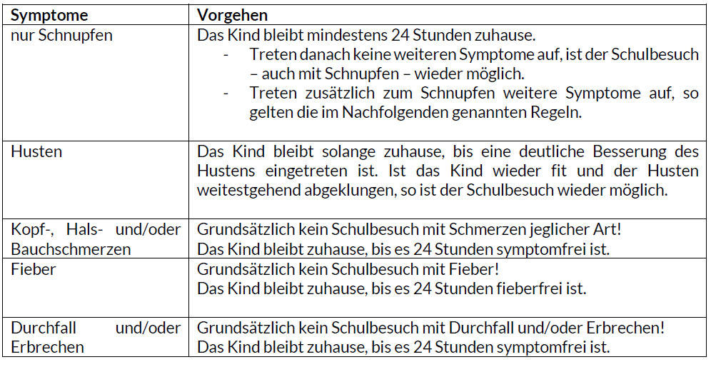 Das gilt für Schüler/innen genauso wie für das Personal der Schule! Personen mit akuten Symptomen dürfen die Einrichtung nicht besuchen!