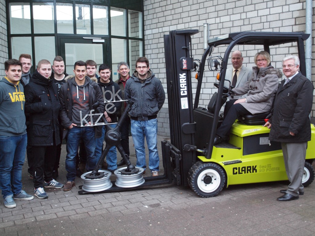 Ein neuwertiger Elektrogabelstapler Clark GEX 20s im Wert von über 15.000 Euro liefert aktuelle Elektromobilität-Technik für den Fachbereich Kraftfahrzeugtechnik am Berufskolleg Erkelenz. Zusätzlich bereichert dieses Flurförderfahrzeug auch die Ausbildung zur Fachkraft für Lagerlogistik/Fachlageristen.