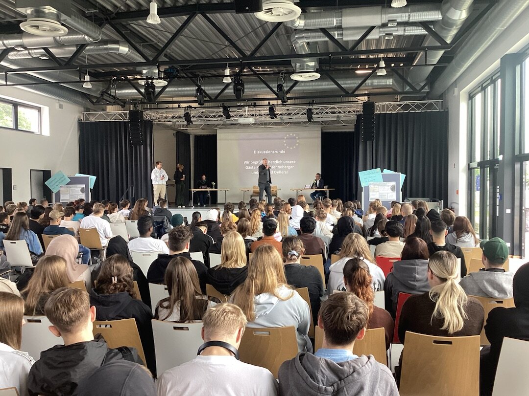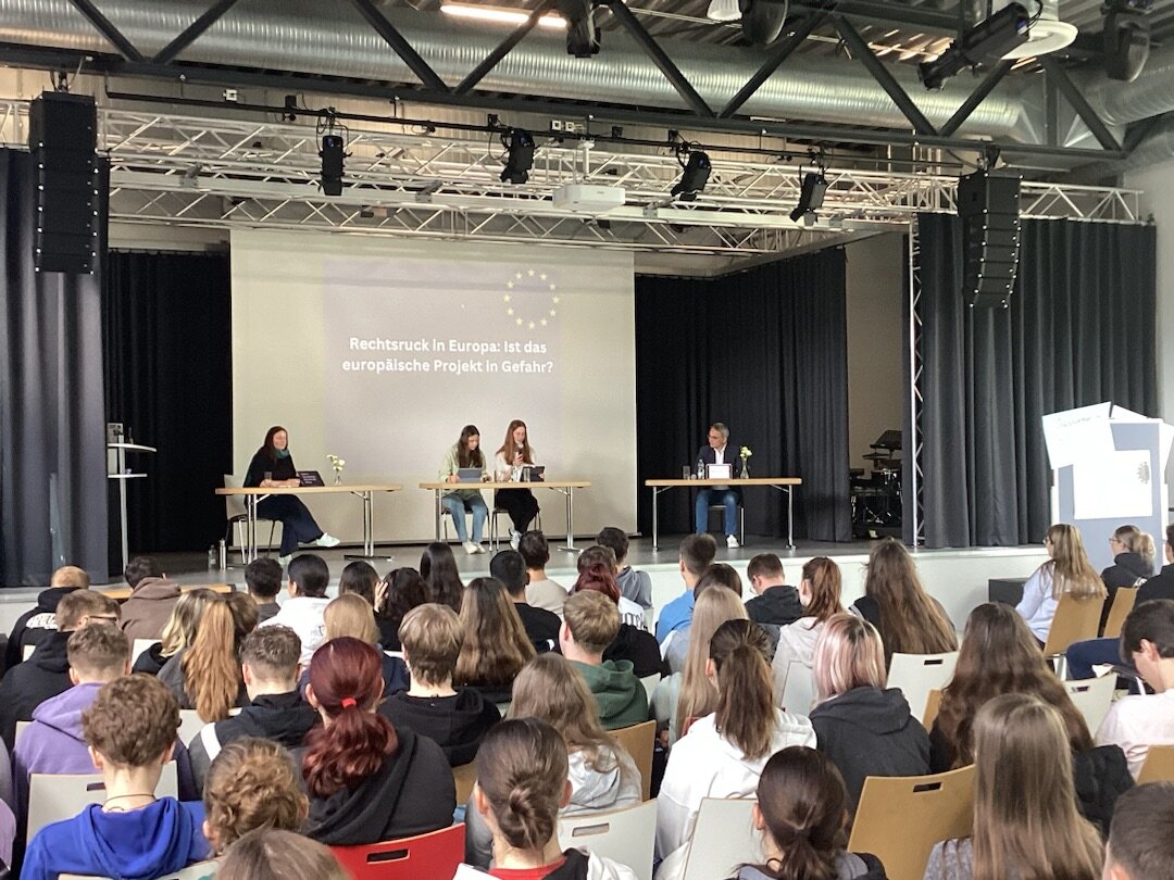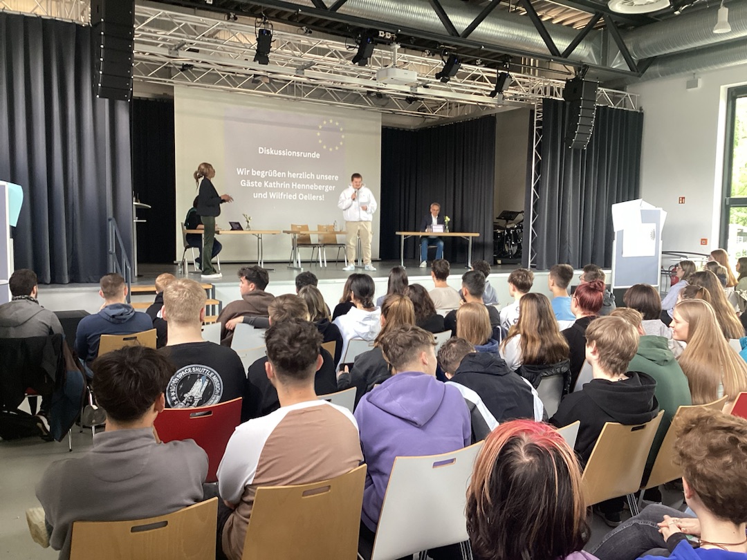Im Anschluss an den "Markt der Möglichkeiten" schloss sich eine Podiumsdiskussion mit Schülerinnen und Schüler sowie unseren Gästen Kathrin Henneberger (Bündnis 90/Die Grünen) und Wilfried Oellers (CDU) an. Jede Gruppe hatte 15 Minuten Zeit, um die Politikerin/den Politiker kritisch zu Herausforderungen wie der Digitalisierung, dem Klimawandel, der europäischen Zusammenarbeit und des politischen Systems der EU Fragen zu stellen. Euch der Rechtsruck und die Beliebtheit populistischer Parteien bei jungen Wählerinnen und Wählern wurde thematisiert.