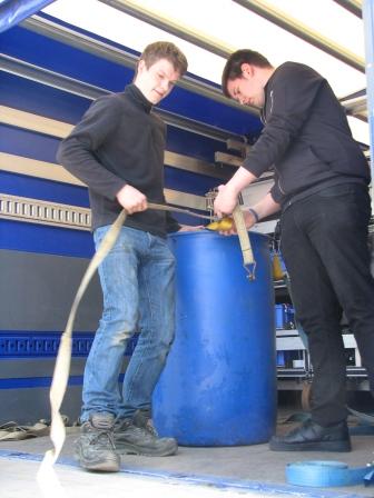 Die theoretischen Inhalte des Berufsschulunterrichts konnten eindrucksvoll anhand der zur Verfügung stehenden Gerätschaften praktisch erprobt und angewandt werden. Ein Gabelstapler und Gitterboxen wurden auf Tiefladern verzurrt und die Verladung und Sicherung der technischen Ausstattung erfolgte auf einem LKW mit Ladebordwand.