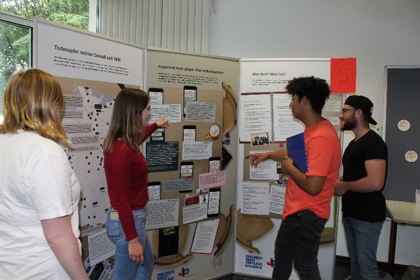 Die Friedrich-Ebert-Stiftung hatte den Schülerinnen und Schülern fünf verschiedene Infotafeln zur Verfügung gestellt, auf denen jeweils unterschiedliche Aspekte zum Thema „Rechtsextremismus“ dargestellt wurden. Die Schüler erarbeiteten dafür vorab in Kleingruppen ihre Themen und übten ihre Vorträge, indem sie diese vor der Klasse vortragen haben. Des Weiteren erstellten die Schüler eigenhändig weiterführende Aufgaben zu ihren zuvor vorgetragenen Themen. So entschied sich eine Gruppe beispielsweise dazu, einen Songwriting-Contest zu erstellen, bei dem ein rechtsextremes Lied umgeschrieben werden musste. Die Gewinner-Gruppe dieses Contests konnte einen 10 € Gutschein vom Schulkiosk gewinnen. Zu Beginn wurde jede Klasse durch das Organisationsteam begrüßt, indem es über den Ablauf der Führung und über die Friedrich-Ebert-Stiftung informierte. Anschließend wurde die Klasse dann in sechs kleine Gruppen eingeteilt und jede Schülergruppe musste sich jeweils an eine Station verteilen. Mit Hilfe eines Signals wurden dann nach 12 Minuten die Stationen gewechselt, so lange, bis alle Gruppen alle Stationen durchlaufen hatten. Die am Ende verbliebenen Minuten nutzten die Schülerinnen des Organisationsteams, um einen Fragebogen an die Schülerinnen und Schüler zu verteilen.