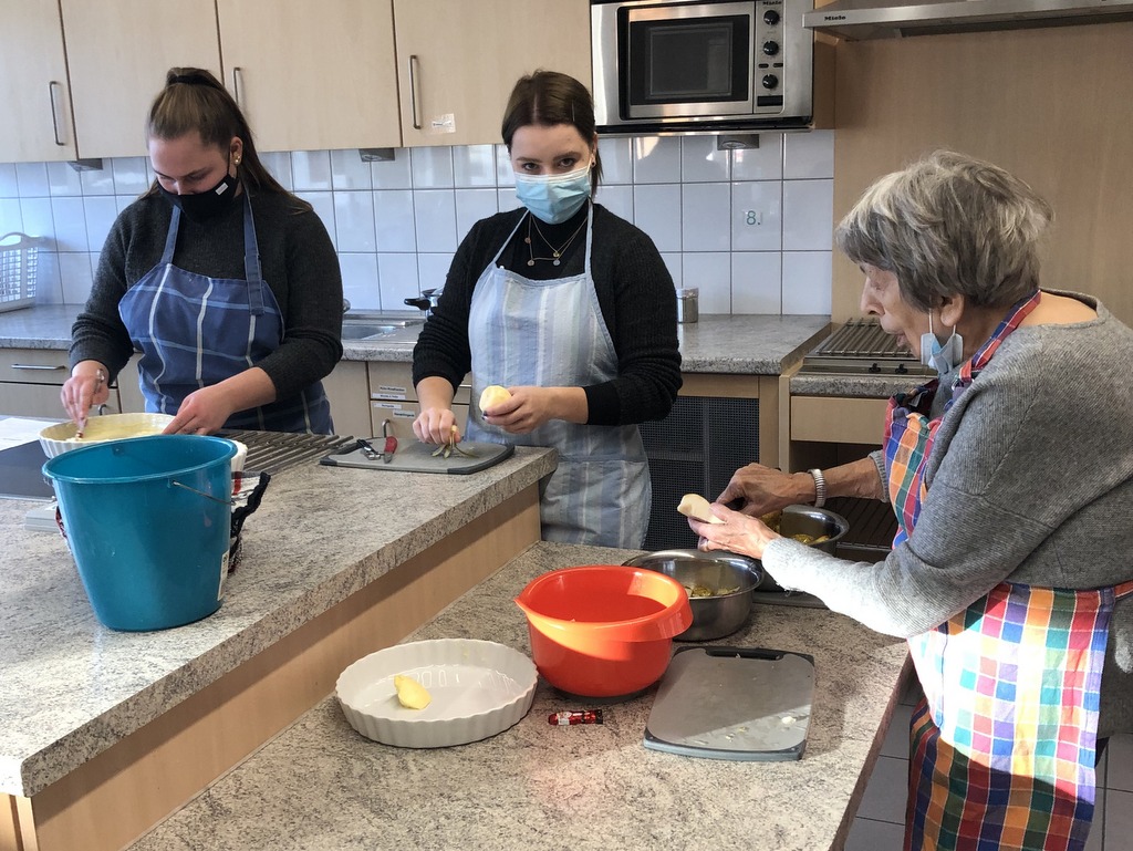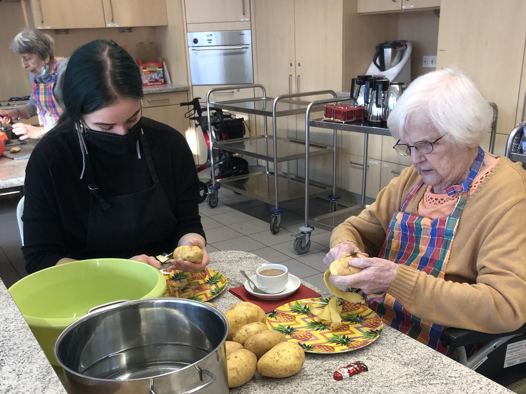 Um 9:40 Uhr rückten unsere Gäste vom Altenheim an. Nach der Begrüßung suchten sie sich ihren „Arbeitsplatz“ aus. Und dann ging es gemeinsam ans schnibbeln, schälen, probieren und erzählen.